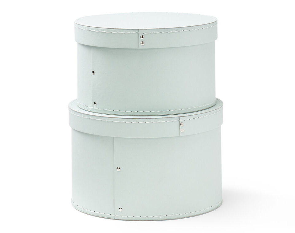 סט עם שתי קופסאות אחסון עגולות מסוגננות עשויות מקרטון קשיח באיכות גבוהה. הקופסאות מגיעות בשני גדלים וניתן לאחסן אותן בקלות אחת בשנייה או לערום אחת לשנייה.