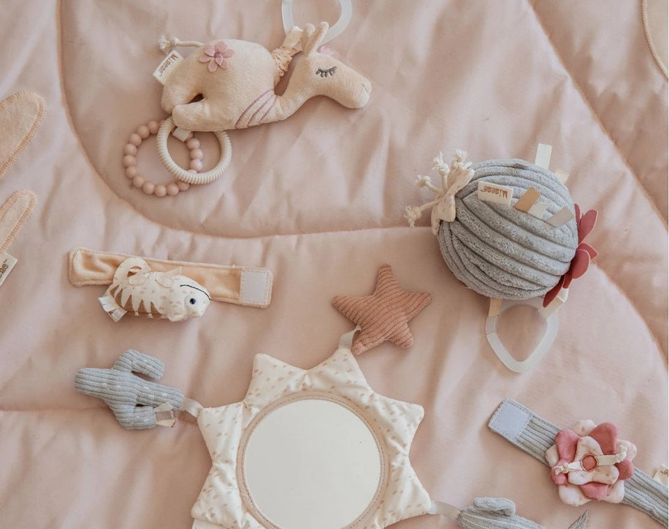 כבר מגיל לידה – כשהתינוק שוכב על הגב וצופה בצעצועים.