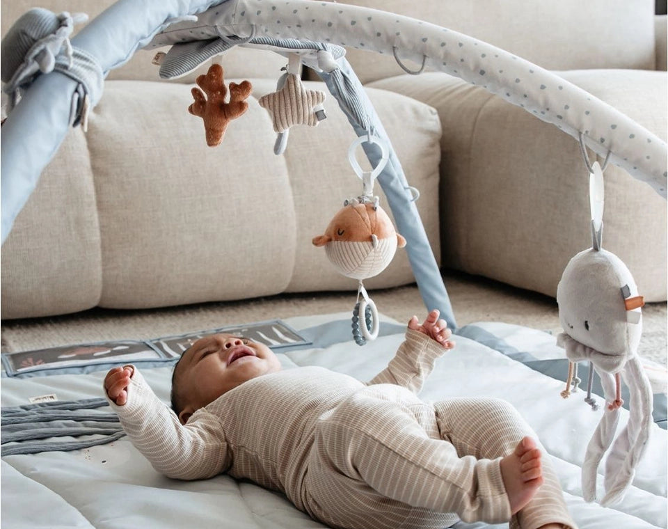 כבר מגיל לידה – כשהתינוק שוכב על הגב וצופה בצעצועים.