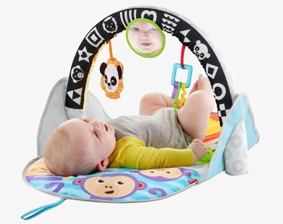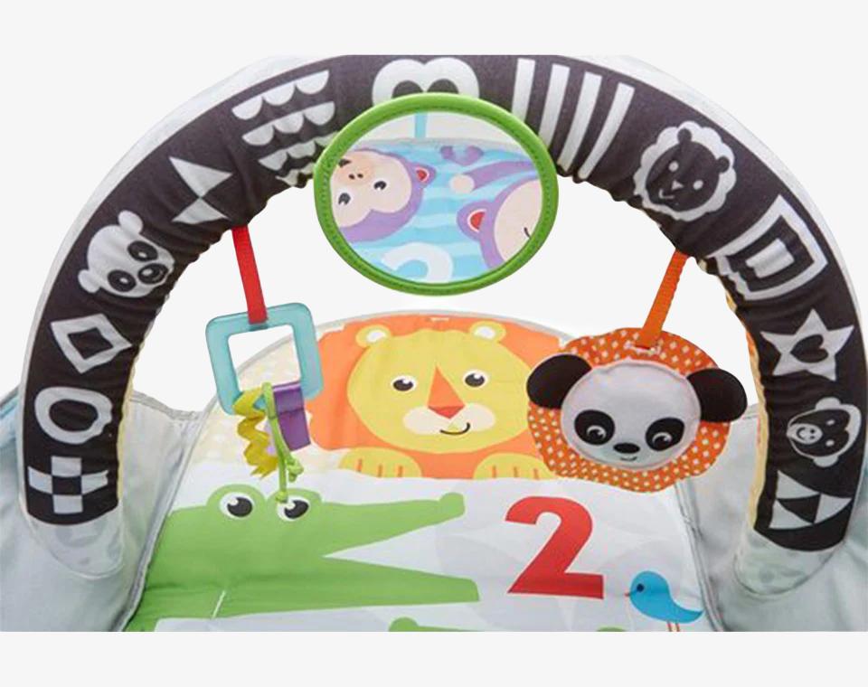 - כולל 3 צעצועי תלייה הניתנים להסרה : מראה לחיזוק הכרת האני של התינוק , רעשן פנדה וצעצועי למישוש
