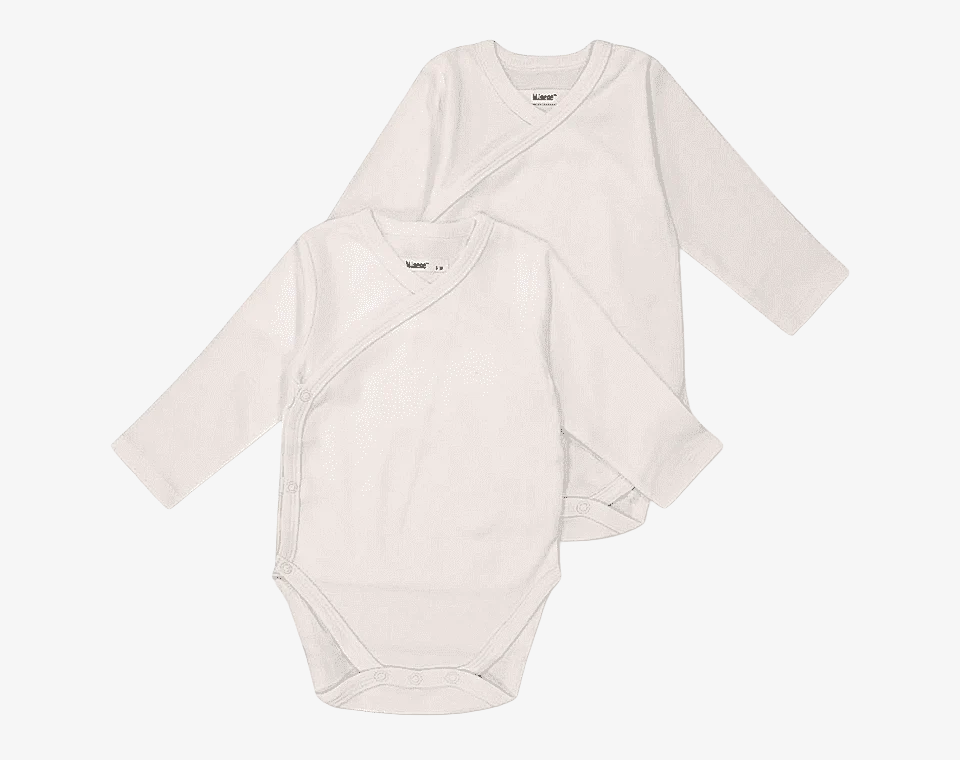 קולקציית הביגוד הראשוני של מיננה מעוצבת ברכות ובנוחות לשימוש יומיומי. זוג בגדי גוף ארוכים ולבנים מבד כותנה.