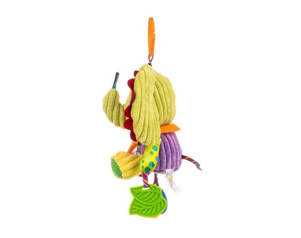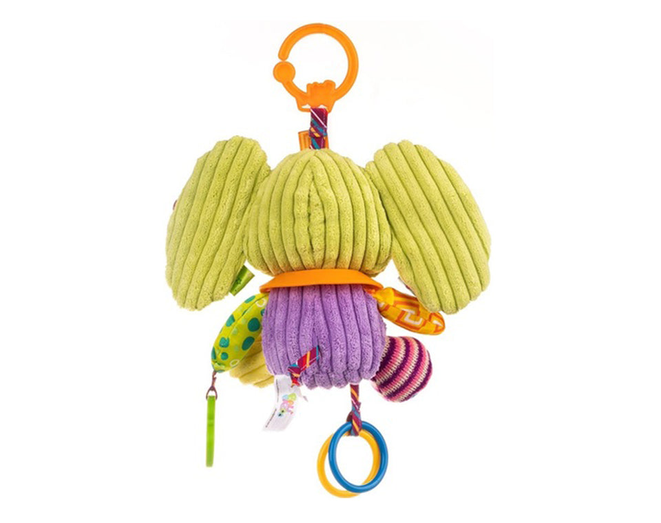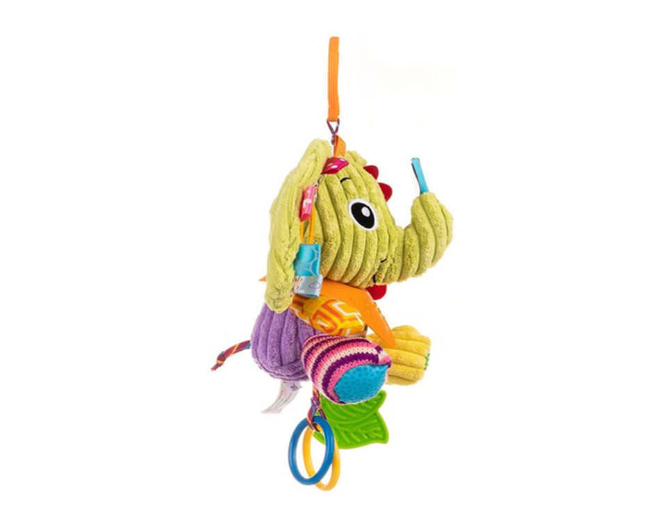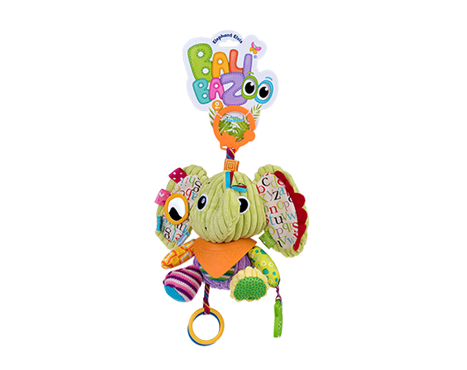 בובת פעילות רב תחושתית אלביס הפיל מבית BALIBAZOO,הבובה צבעונית ובעלת מגוון רב של מרקמי בד שונים, באוזנו של הפיל מראה , בחלקה התחתון של בובת אלביס תלויים נשכנים