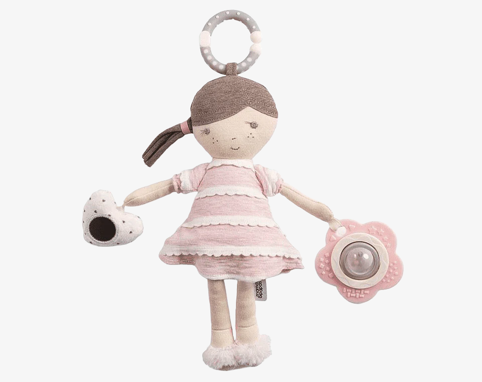 בובת תלייה דגם "בלה" מבית ממס&פפס, בובת בלה כוללת צלילים נסתרים שניתן לגלות אותם באמצעות ניעור, נשכן ומראה בצורת לב