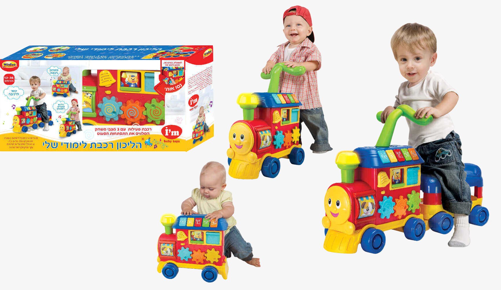 רכבת פעילות משולבת עם הליכון לתינוק ובימבה. על גבי ההליכון לתינוק גלגל מסתובב לצליל מנגינות קלאסיות עליזות. בצידי קטר הרכבת ממוקמים חלונות נפתחים וגלגלי שיניים נעים לרקע צלילים משעשעים.