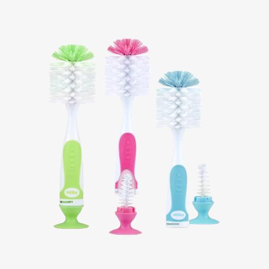 מברשת לניקוי פטמות ובקבוקים הכוללת בסיס נצמד שמסייע לשמור על המברשת כשהיא עומדת ומרחיק ממנה את החיידקים. הידית בעלת המרקם העדין מבטיחה אחיזה נוחה. המברשת כוללת שתי מברשות במוצר אחד, כאשר מברשת הפטמות נשמרת בצורה נוחה בתוך הידית.
