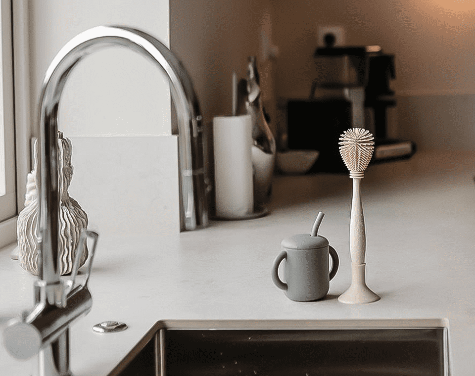 מברשת דו-צדדית חכמה עם ראשי סיליקון רכים לניקוי בקבוקים, פיות ואזורים צרים. מעוצבת לנוחות מרבית ונשמרת בצורה מסודרת בבסיס עם יניקה.