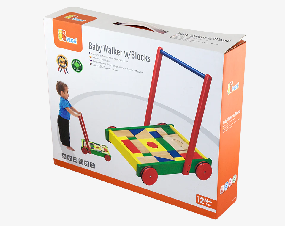 הליכון פעילות עם 36 קוביות עץ מבית Viga , העגלה הקלאסית מכילה 36 בלוקים מעץ בעלי צורות וצבעים שונים. על הגלגלים יש טבעות גומי כדי למנוע החלקה. מתאים לגילאי שנה ומעלה