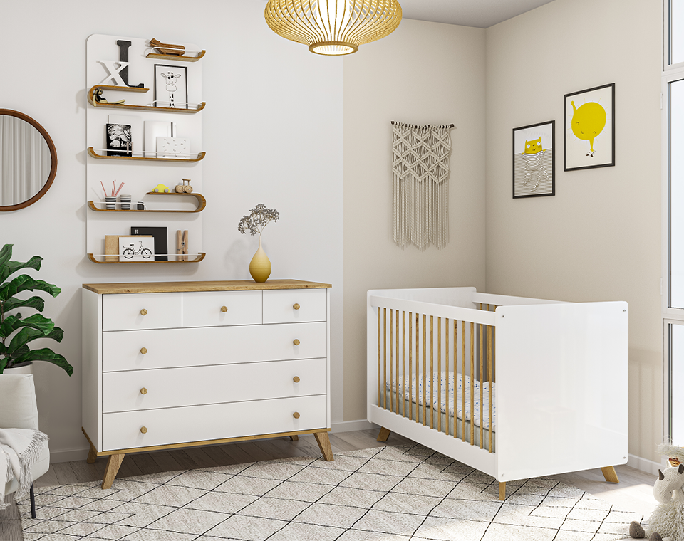 חדר פארק מבית טל רהיטי תינוקות, הכל כולל שידת אחסנה מדגם "פארק" ומיטת תינוק מדגם "קלואי"