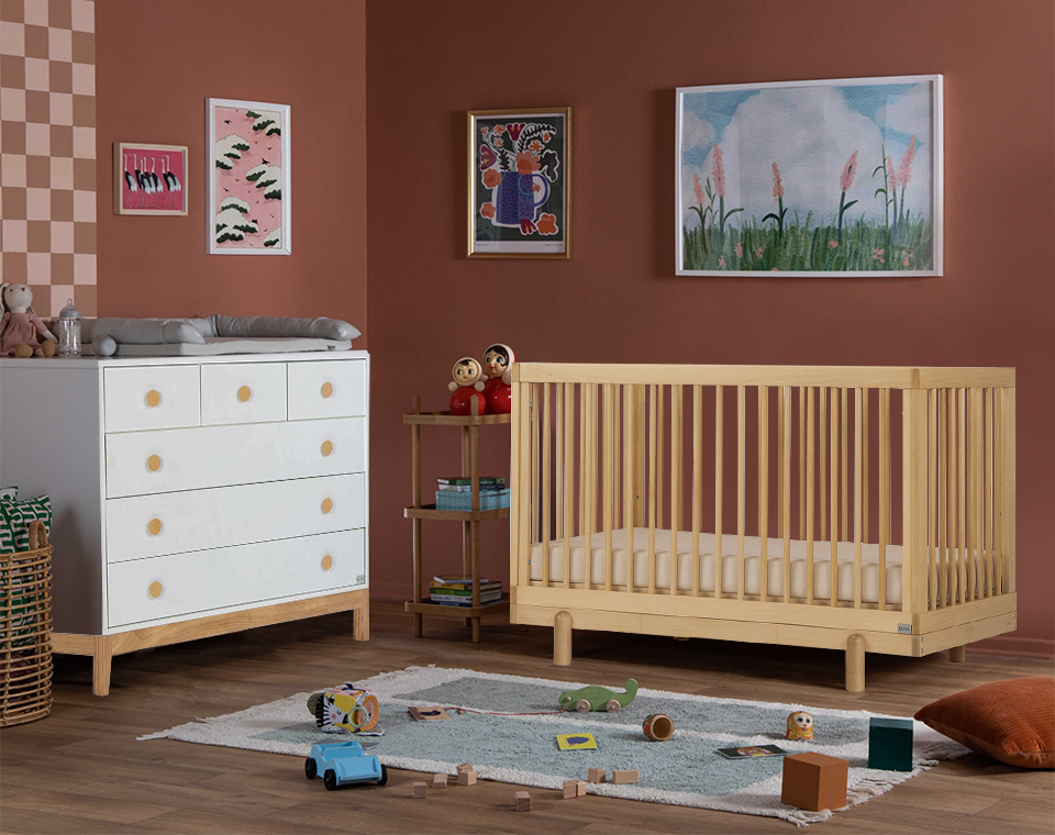 חדר תינוקות מבית "רהיטי סגל", כולל מיטת תינוק מדגם "רוז" בצבע טבעי ושידת אחסנה מדגם "ליז" לבן-טבעי.