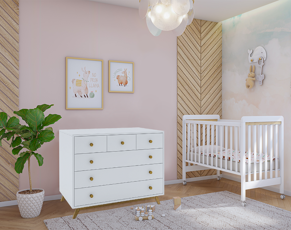 חדר תינוקות מבית טל רהיטי תינוקות, כולל מיטת תינוק מדגם "קליפורניה" ושידת אחסנה מדגם "ג'רזי"