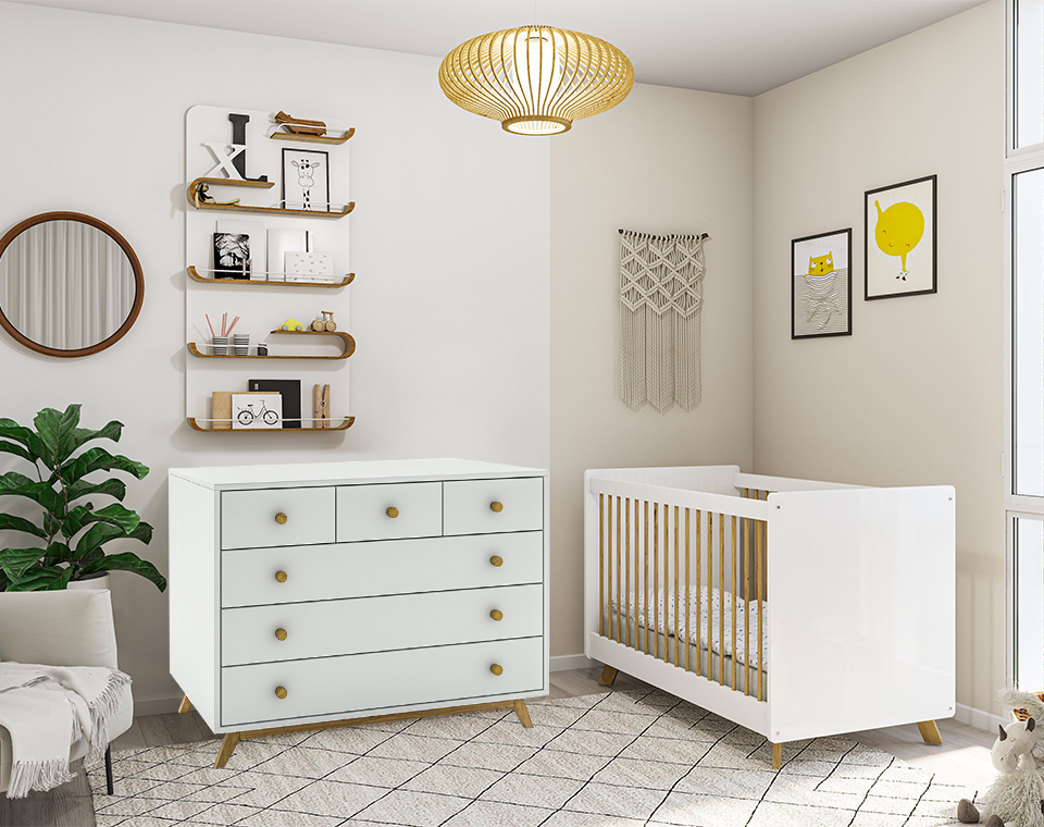 חדר תינוקות מבית טל רהיטי תינוקות, כולל מיטת תינוק מדגם "קלואי" ושידת אחסנה מדגם "ג'רזי"