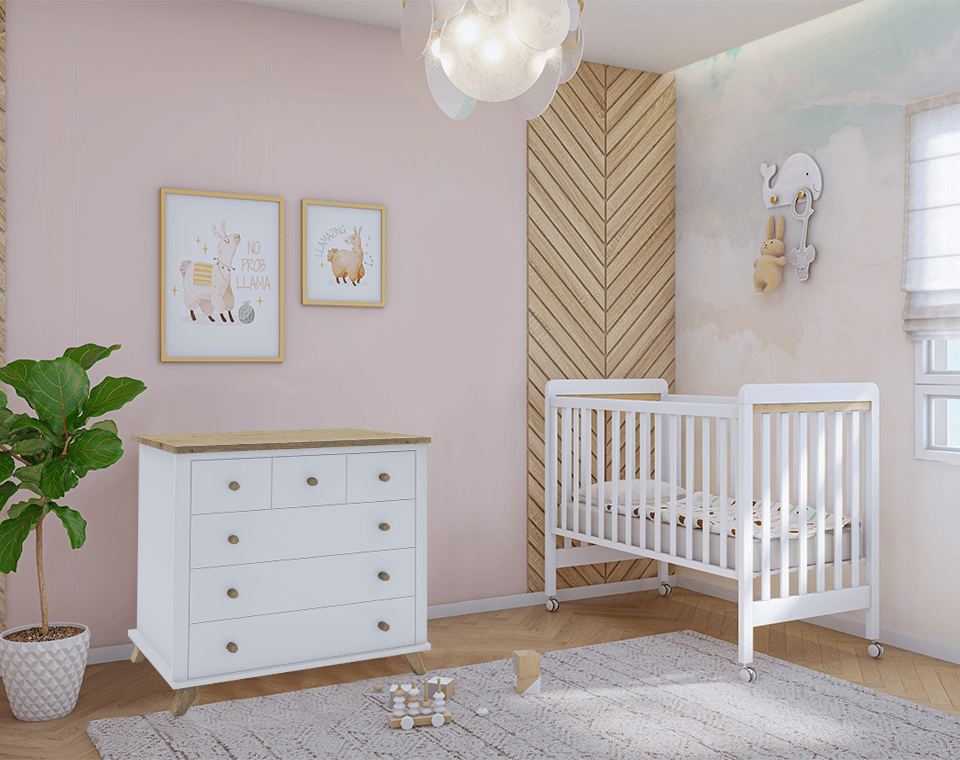 חדר תינוקות מבית טל רהיטי תינוקות, כולל מיטת תינוק מדגם "קליפורניה" ושידת אחסנה מדגם "בילי"