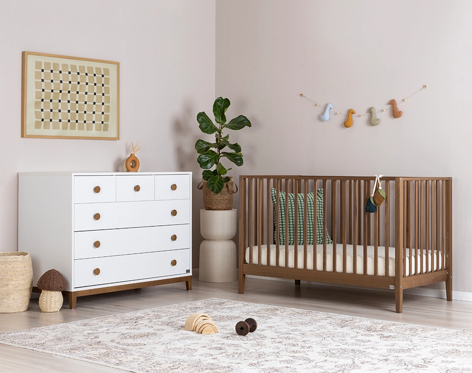 חדר תינוקות להלה המורכב ממיטת תינוק להלה ושידה ליז המיוצרים באיטליה, ומעוצבים בקווים מינימליסטים ישרים, שמצליחים לייצר קסם של אלגנטיות.