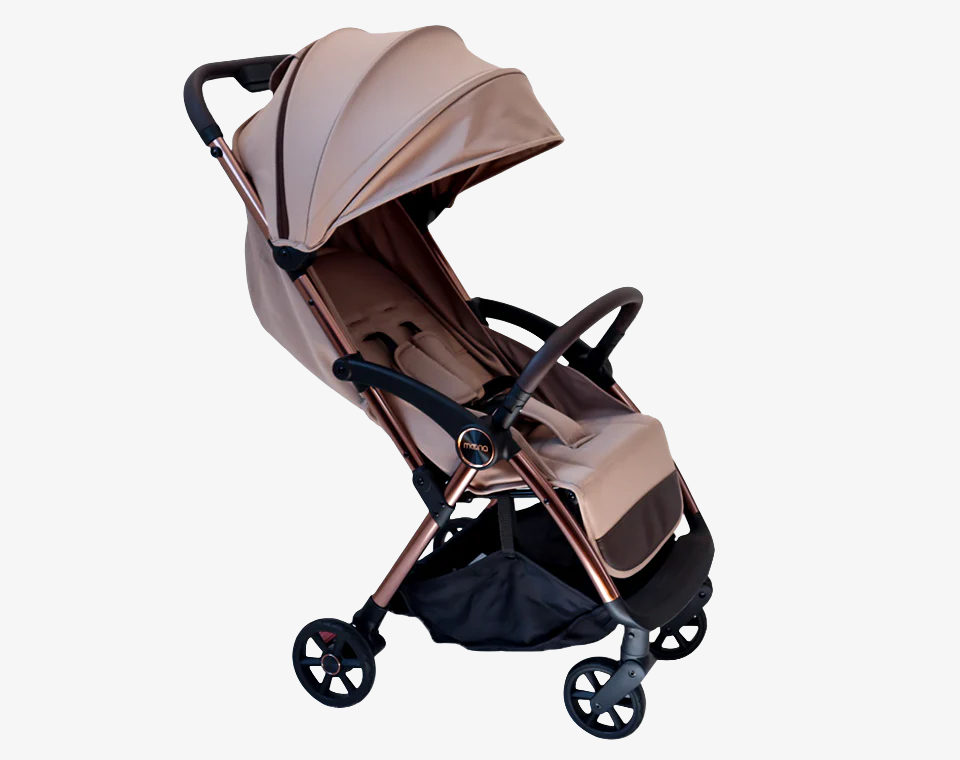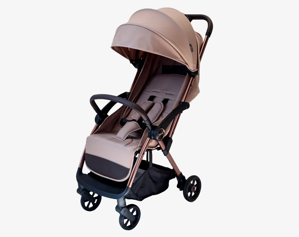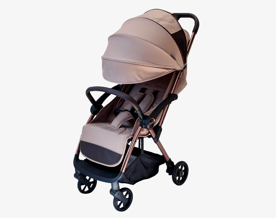 טיולון דגם Iggy מבית MOONA בצבע טופי עם שלד שמפניה וידיות עור בצבע חום כהה