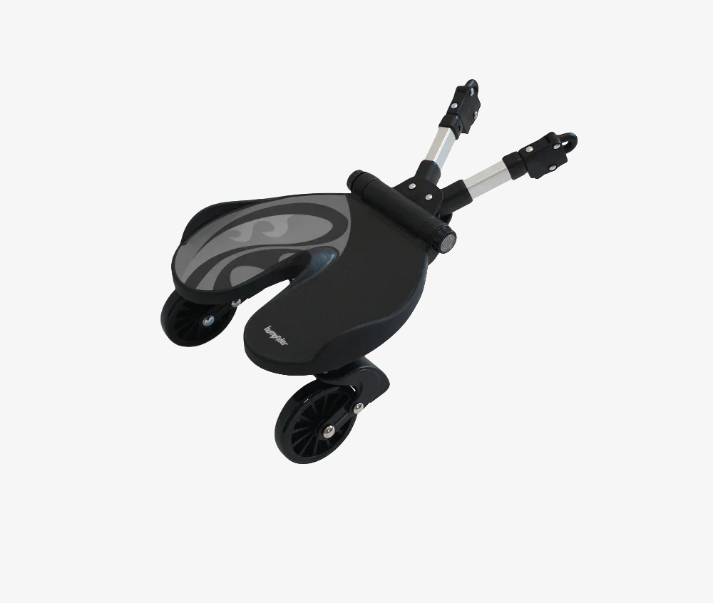 מתקן טרמפיסט צבע אפור. הטרמפיסט הינו מתקן אוניברסלי המיועד להתחבר לעגלות ולאפשר לאח/ות בוגרים יותר לעמוד מאחור בזמן שהאח או האחות הקטנים "תפסו" להם את העגלה.