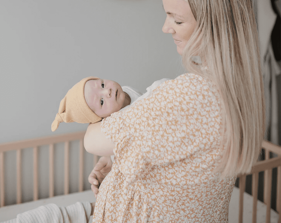 כובע ריב עם קשירה מבית MUSHIE, עשוי מכותנה אורגנית. מושלם כדי לחמם את האוזניים הקטנטנות של תינוקך