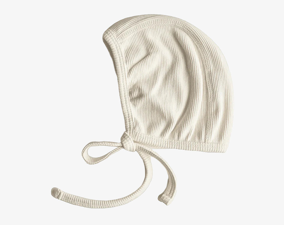 כובע בונט מבד ריב מבית Mushie עשוי מכותנה אורגנית, מכסה באופן מלא את האוזניים ומעניק חום ומקסימום נוחות