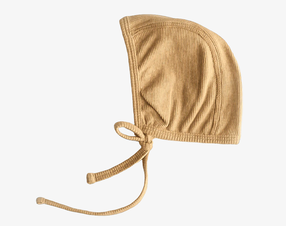כובע בונט מבד ריב מבית Mushie עשוי מכותנה אורגנית, מכסה באופן מלא את האוזניים ומעניק חום ומקסימום נוחות