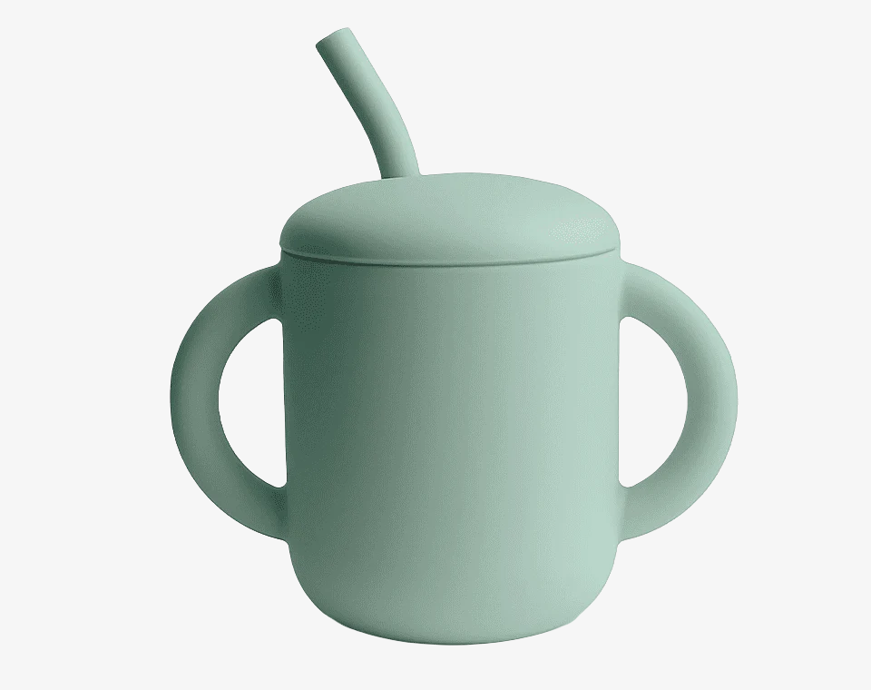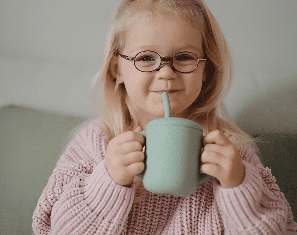 כוס השתייה של Mushie מגיעה עם מכסה נשלף וידיות אחיזה המותאמות לידיים הקטנטנות של ילדכם