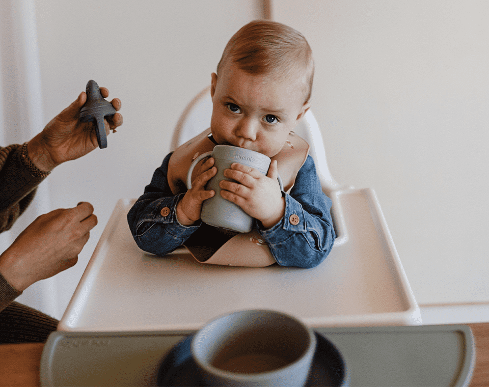 כוס אימון מושלמת לתינוק מבית Mushie – בעיצוב נקי ואלגנטי, עם ידיות אחיזה נוחות, מכסה נשלף וחומרים בטוחים לשתייה עצמאית ומהנה.