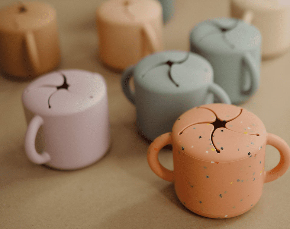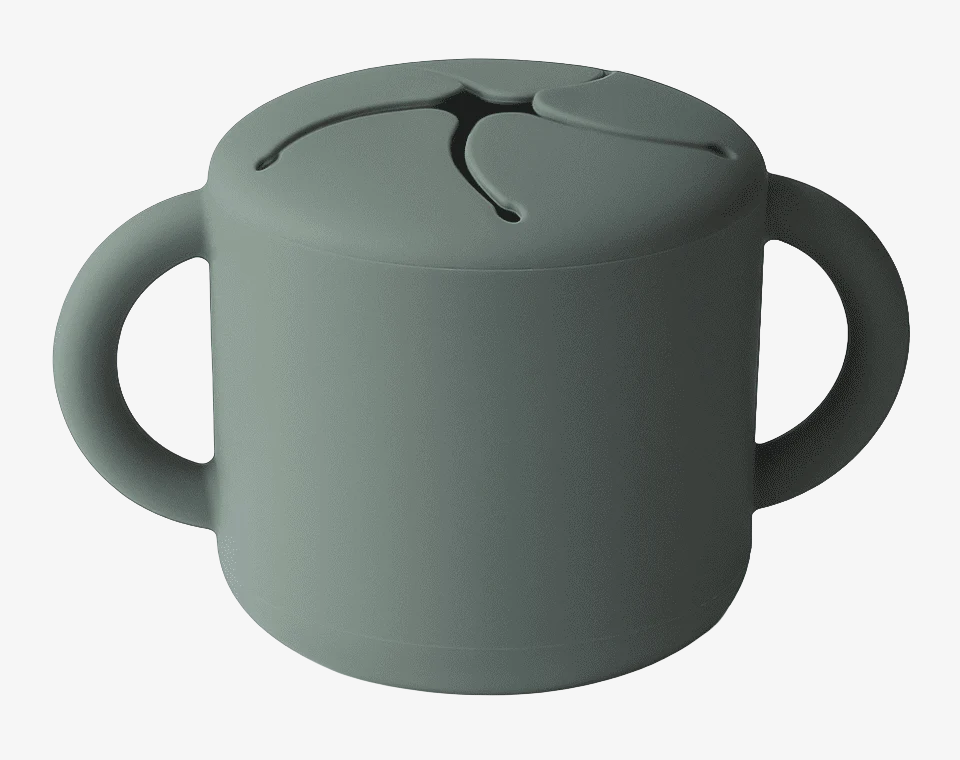כוס חטיפים מסיליקון מעוצבת עם שתי ידיות קטנות לאחיזה עבור ידיים קטנות, ובנויה במבנה המגן על תכולתה