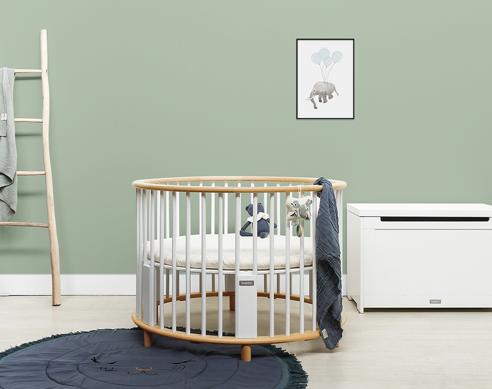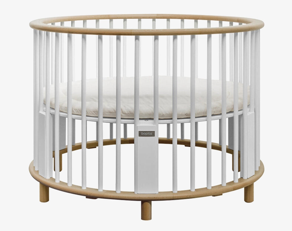 לול רונדו מודרני עם מוטות עגולים. תחתית הלול ניתנת לשינוי גובה בהתאם להתפתחות התינוק, במצב העליון יכול לשמש כעריסה ומיטה לכל דבר
