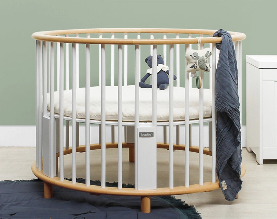 - לול רונדו מודרני עם מוטות עגולים. תחתית הלול ניתנת לשינוי גובה בהתאם להתפתחות התינוק