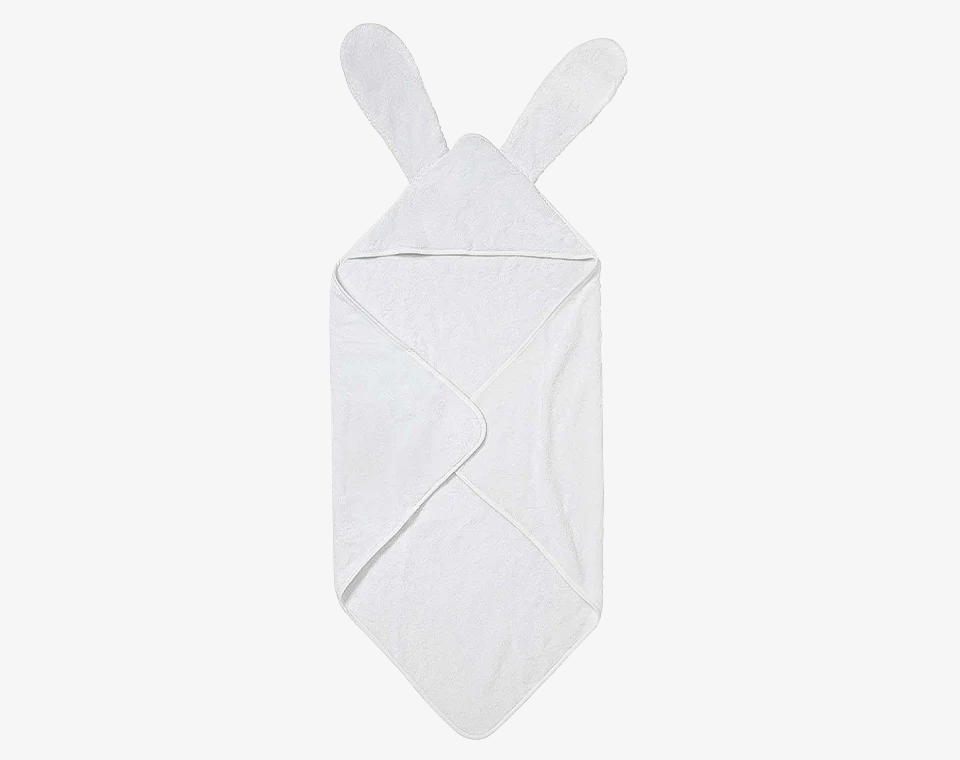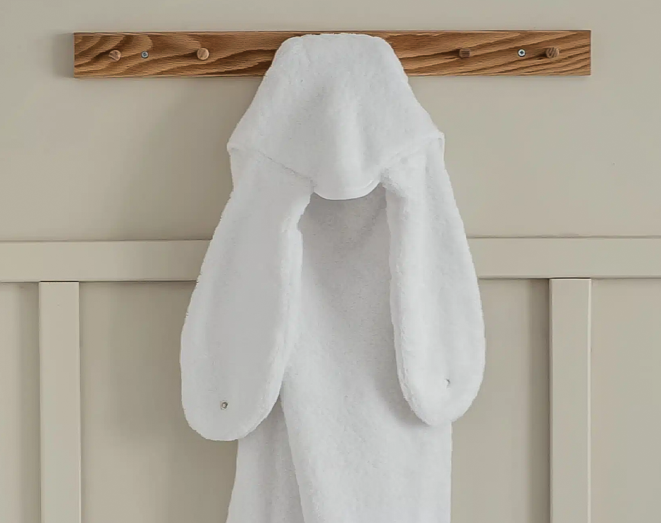 - המגבת מגיעה עם אוזני ארנב הנקשרים מסביב לצוואר ההורה בקלות בעזרת תיקתקים ובכך משאירות את שתי ידיו פנויות להחזקת התינוק.