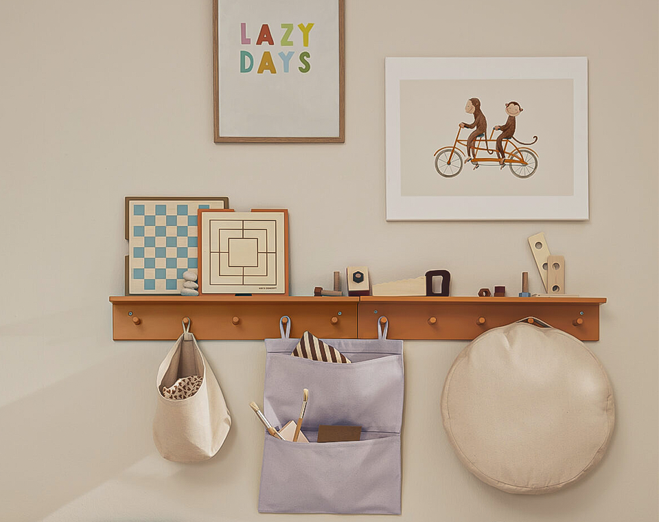 מדף מעץ עם ווי תליה, הווים מפוזרים באופן שווה כך שניתן להציב מספר מדפים אחד ליד השני.
