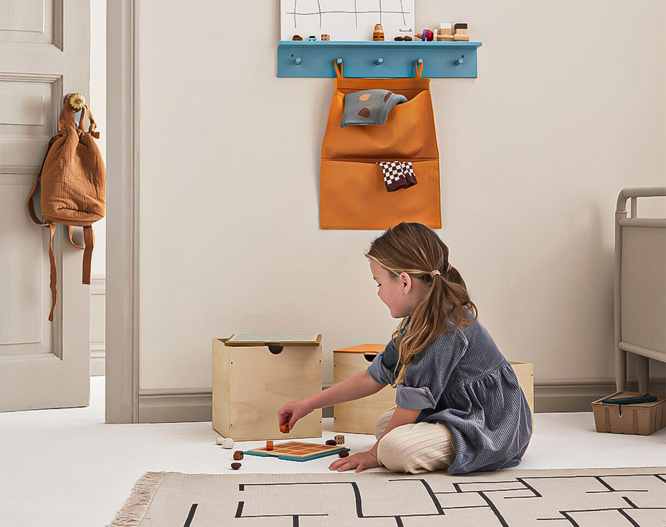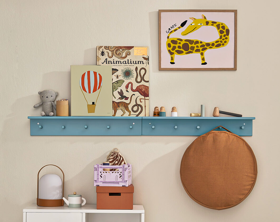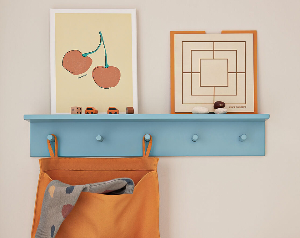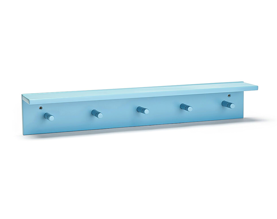 מדף מעץ עם ווי תליה, הווים מפוזרים באופן שווה כך שניתן להציב מספר מדפים אחד ליד השני.