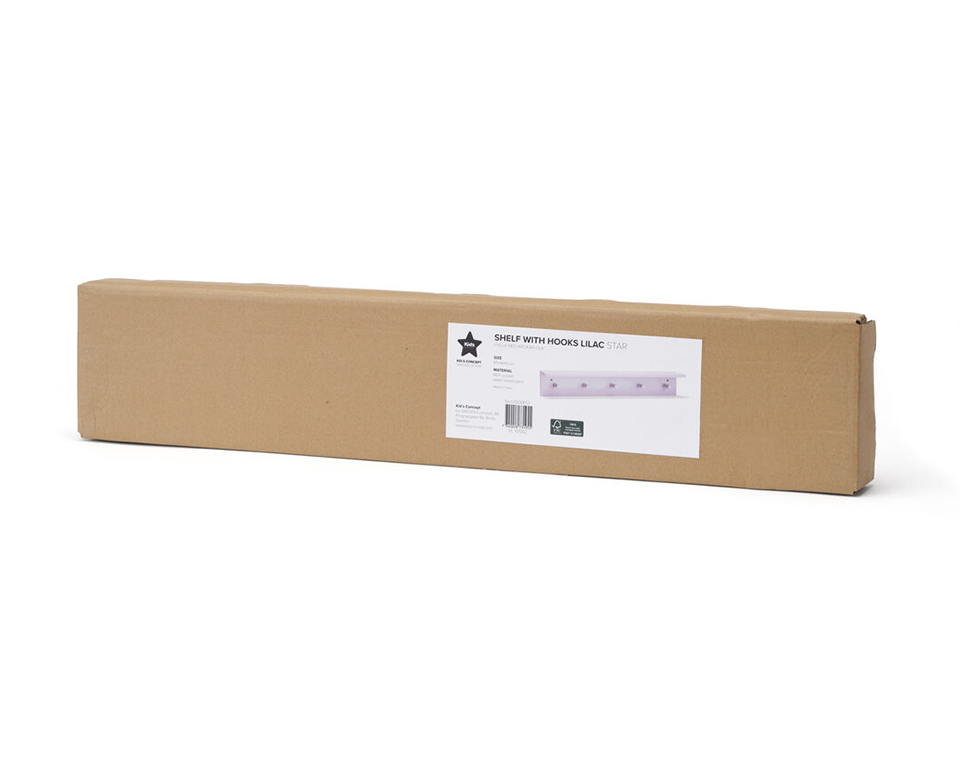 מדף מעץ עם ווי תליה, הווים מפוזרים באופן שווה כך שניתן להציב מספר מדפים אחד ליד השני.