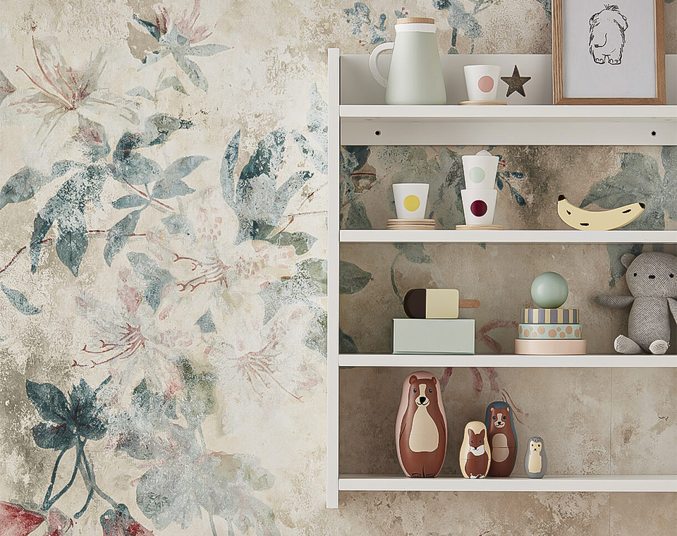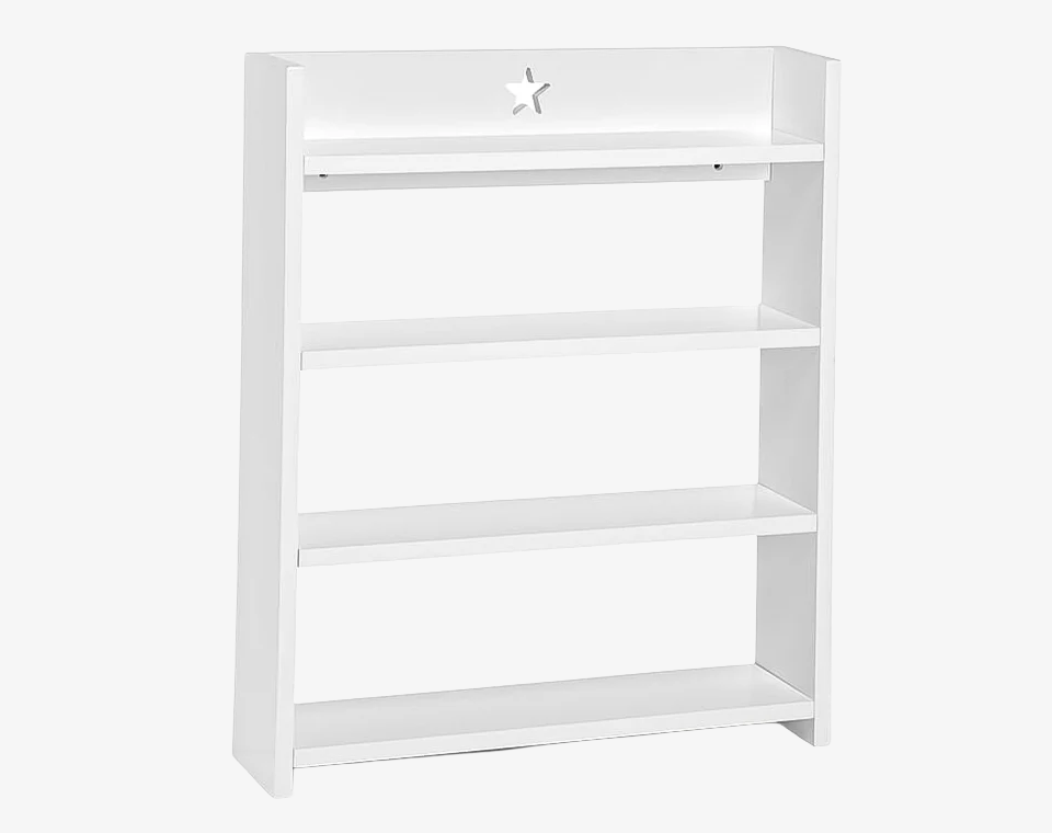 מדף קיר מעץ לבן מקולקציית STAR, מעולה לאחסן ספרים, צעצועים רכים ודברים אהובים אחרים.