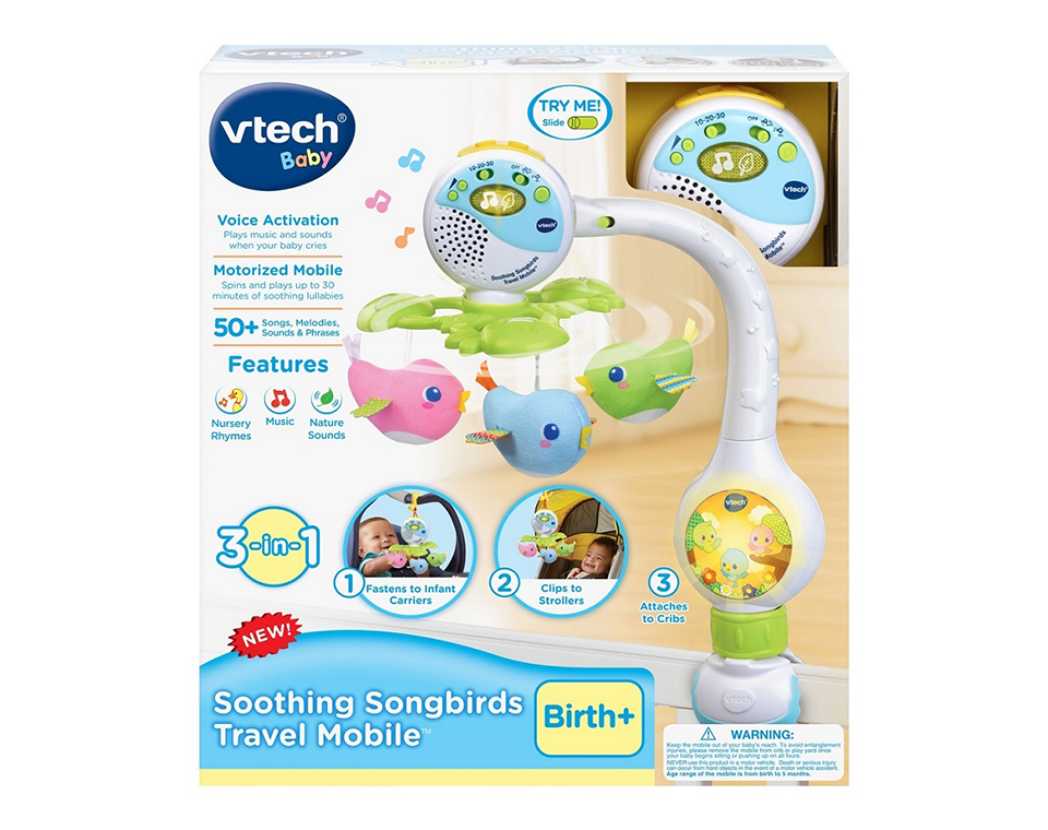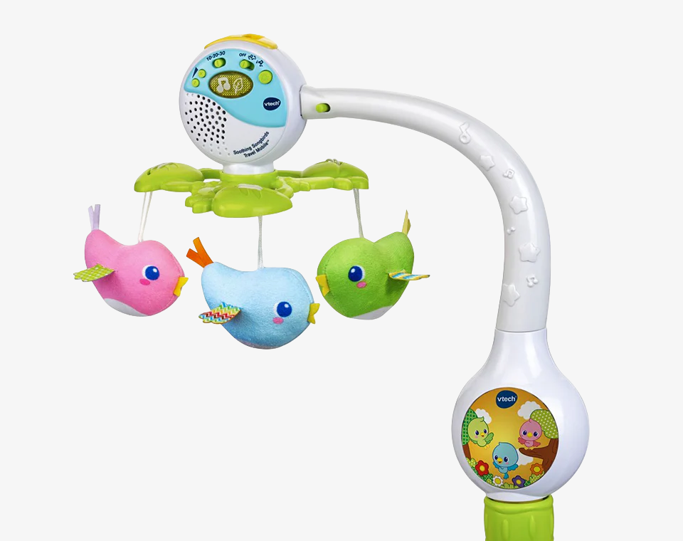 - מובייל קסום עם בובות בד נעימות בצורות ציפורים צבעוניות שמסתובבות ומעודדות אינטראקציה ויזואלית עם מגוון של צלילים ותכונות העוזרות לתינוק לעבור למצב רגוע ולשינה.