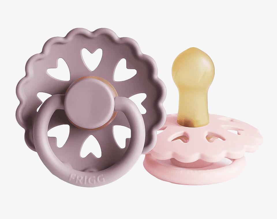 זוג מוצצי גומי מקולקציית Fairytale מבית FRIGG מעוצבים לנוחות תינוקך עם לטקס טבעי ותכונות מרגיעות.