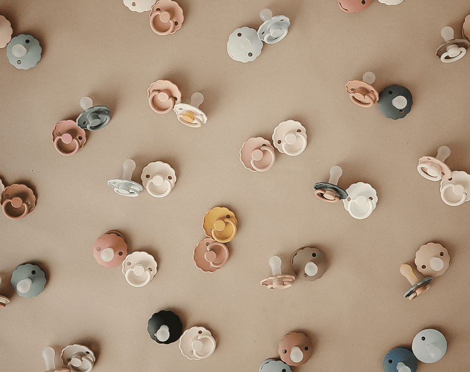 זוג מוצצי סיליקון מקולקציית DAISY מבית FRIGG עוצבו בקפידה בכדי לשמור על נוחות תינוקכם.