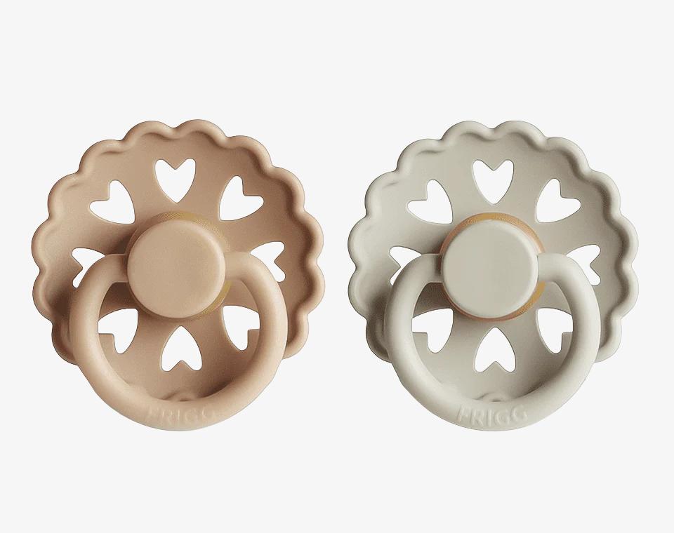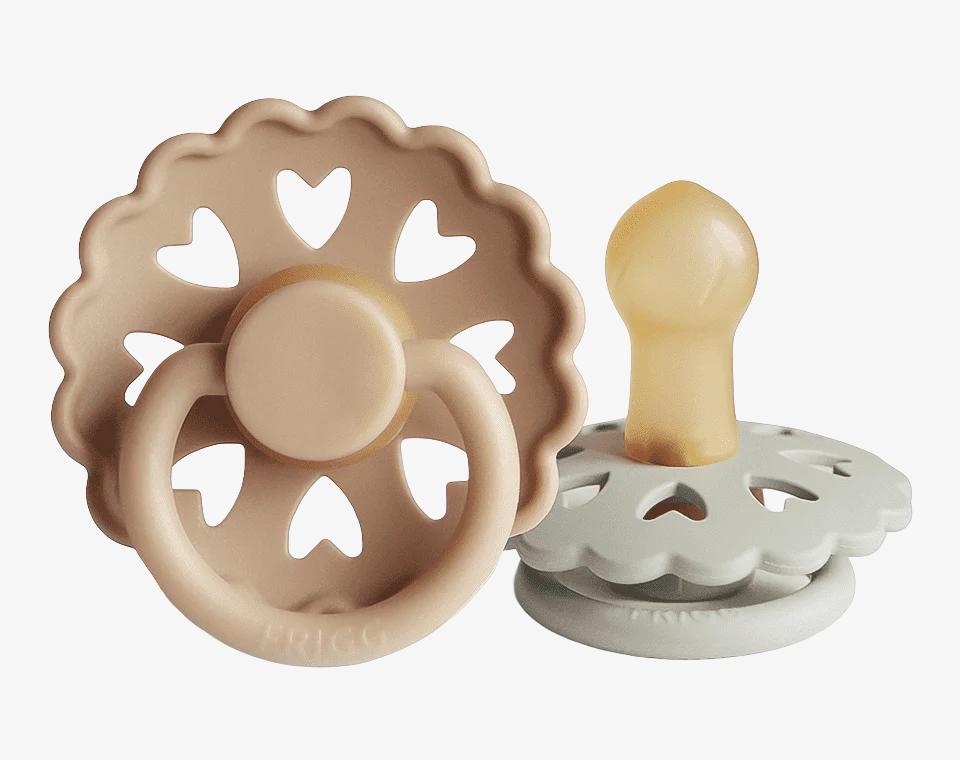 זוג מוצצי גומי מקולקציית Fairytale מבית FRIGG מעוצבים לנוחות תינוקך עם לטקס טבעי ותכונות מרגיעות.
