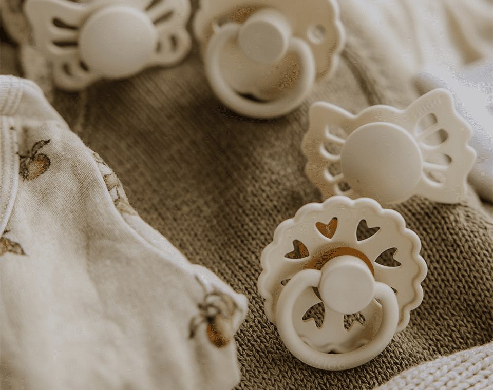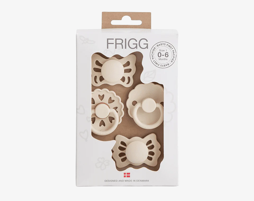 מארז מוצצים ייחודי מבית FRIGG, הכולל ארבעה מוצצים בעיצובים שונים ובסוגי פטמות מגוונים – סיליקון רפואי וגומי טבעי – כדי לאפשר לתינוקך לנסות ולהתחבר למוצץ המתאים לו ביותר.