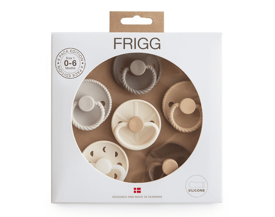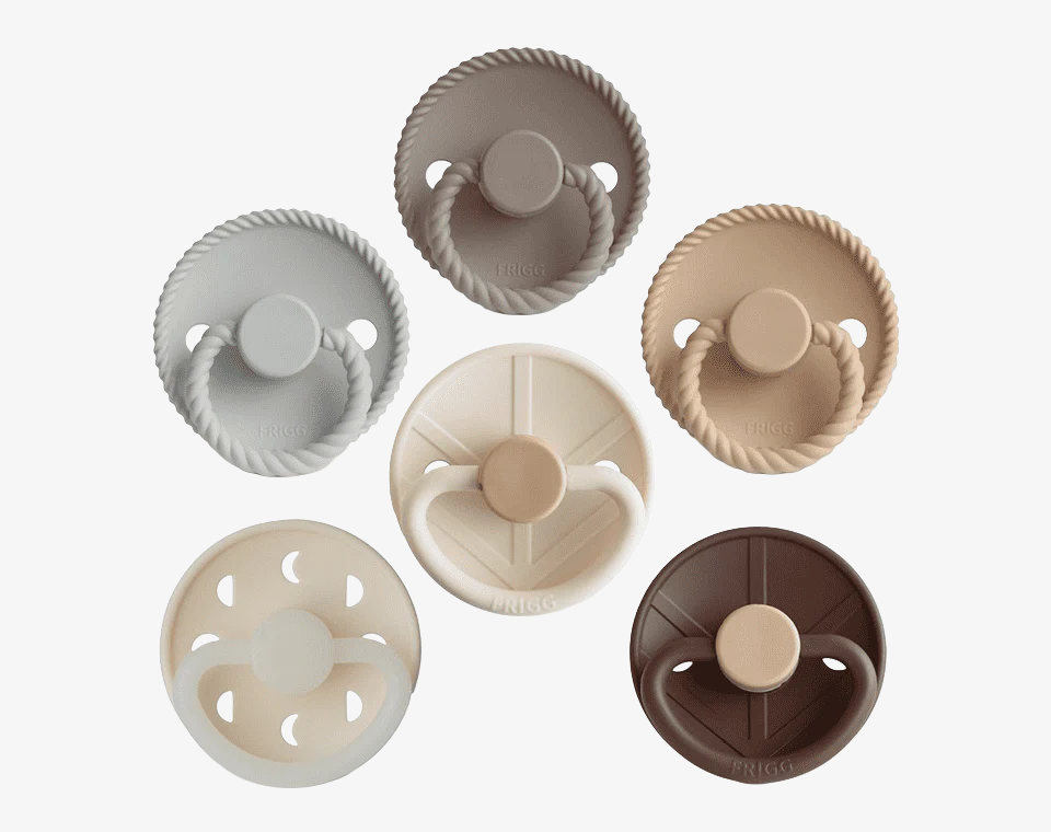 מארז שישיית מוצצי סיליקון בעלי פטמה עגולה מבית FRIGG – בעיצובים וצבעים שונים, כדי להעניק לתינוקך חוויית שימוש מגוונת, בטוחה ונעימה.