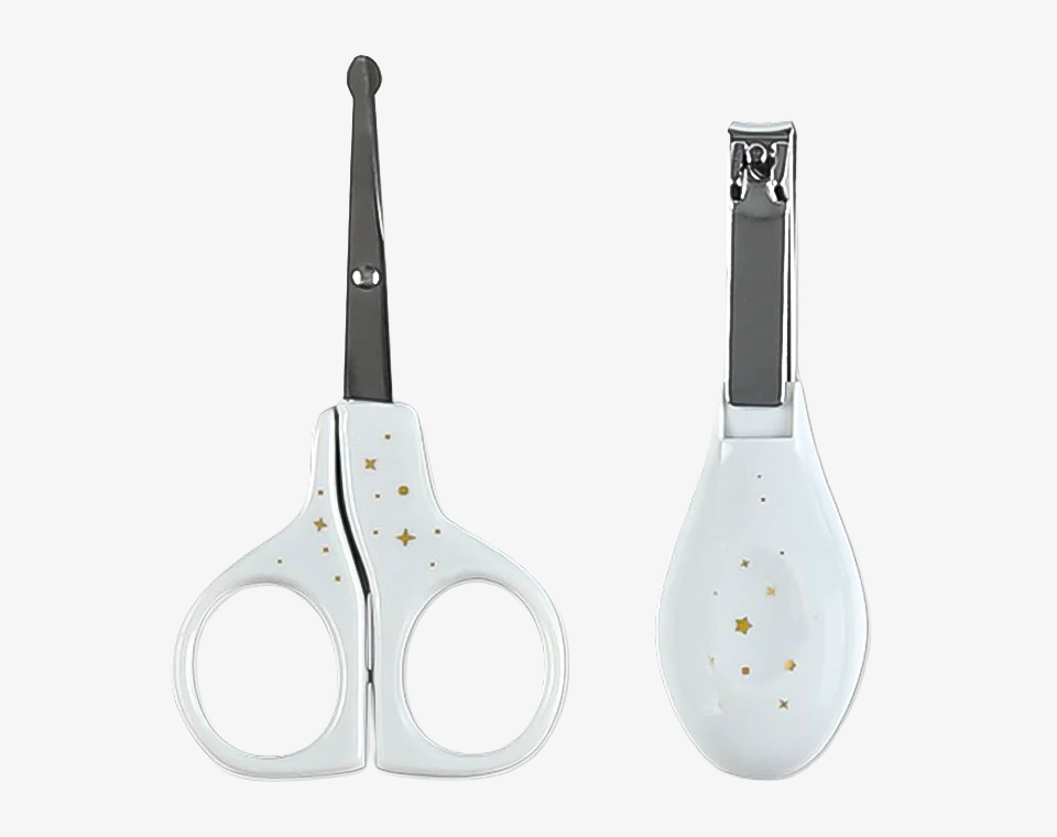 סט טיפוח לתינוק הכולל מספריים וקוצץ לגזירת ציפורניים קטנות ועדינות.