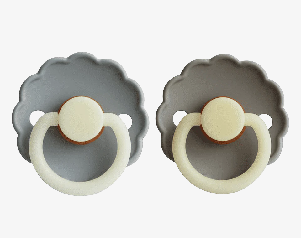 זוג מוצצי גומי מקולקציית DAISY NIGHT מבית FRIGG מצוידים בפונקציית זוהר עדינה בחושך שלא תזיק לעיני התינוק.