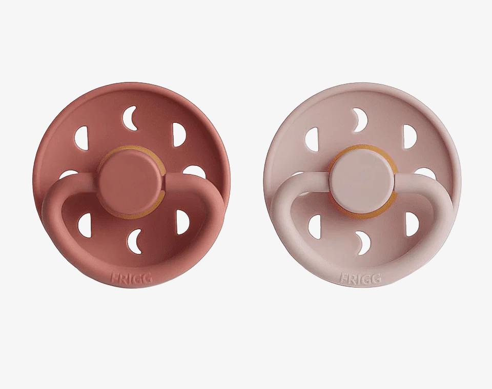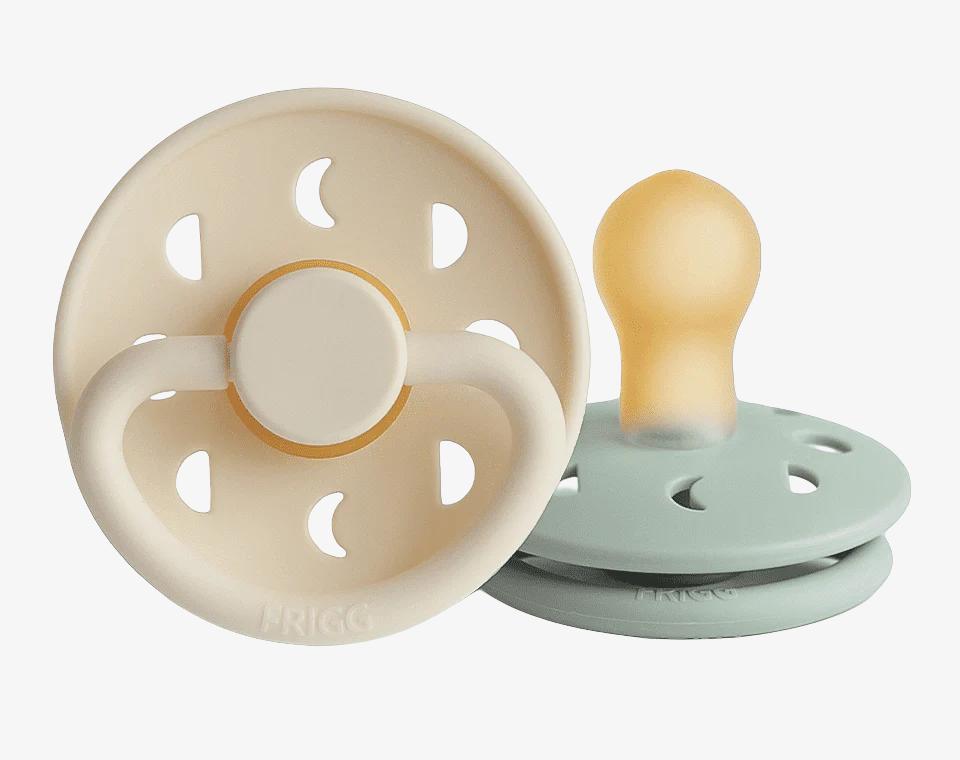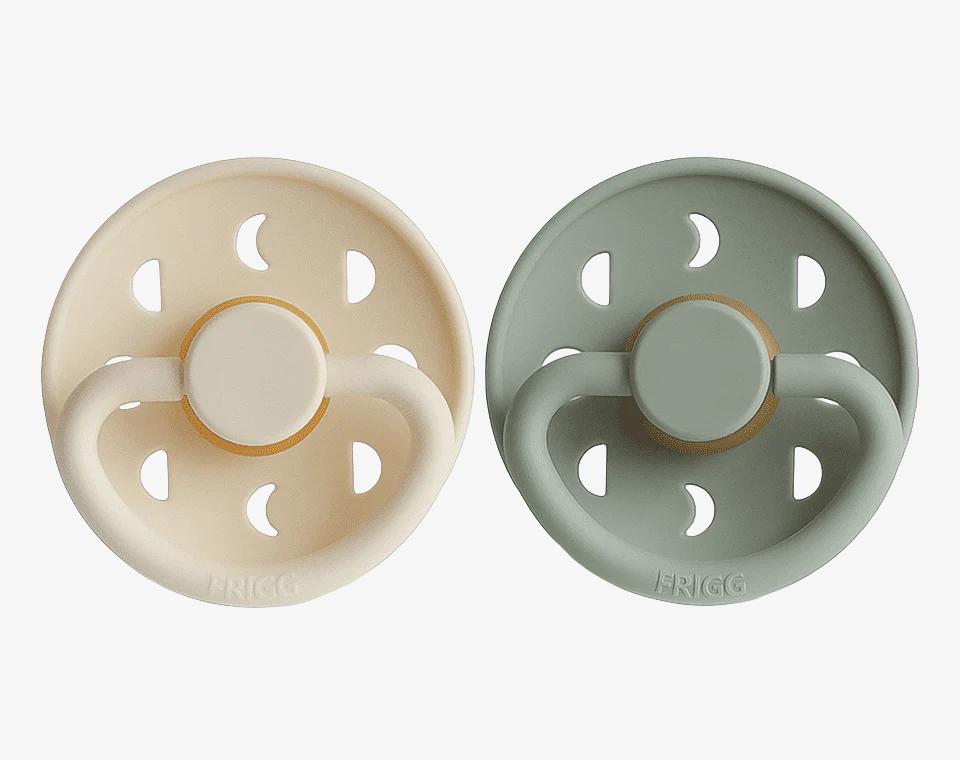 זוג מוצצי גומי מקולקציית MOON מבית FRIGG בעלי עיצוב ייחודי בהשראת הירח, עוצבו בקפידה בכדי לשמור על נוחות תינוקכם.
