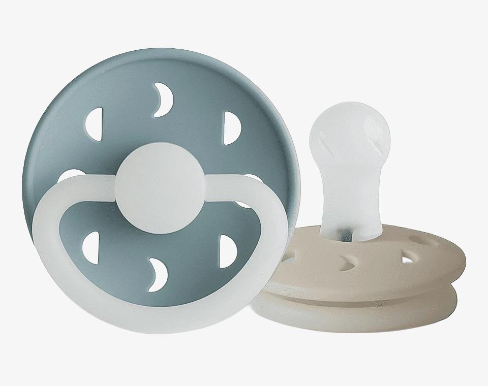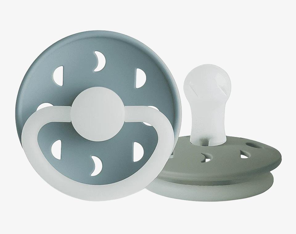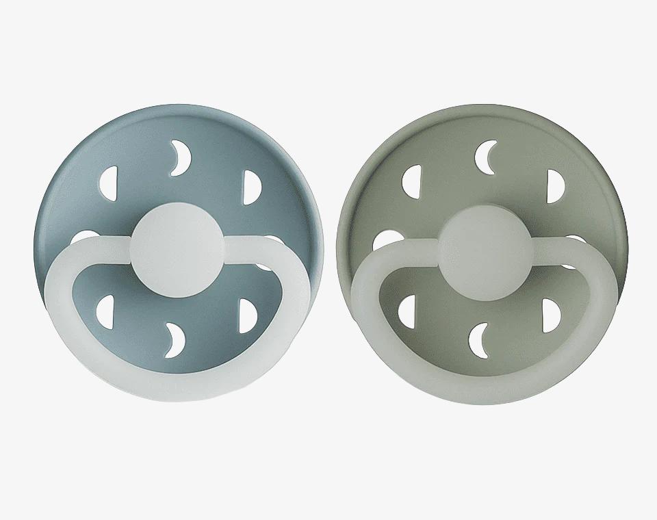 זוג מוצצי סיליקון מקולקציית MOON NIGHT מצוידים בפונקציית זוהר עדינה בחושך שלא תזיק לעיני התינוק.
