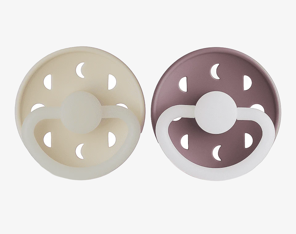זוג מוצצי סיליקון מקולקציית MOON NIGHT מצוידים בפונקציית זוהר עדינה בחושך שלא תזיק לעיני התינוק.