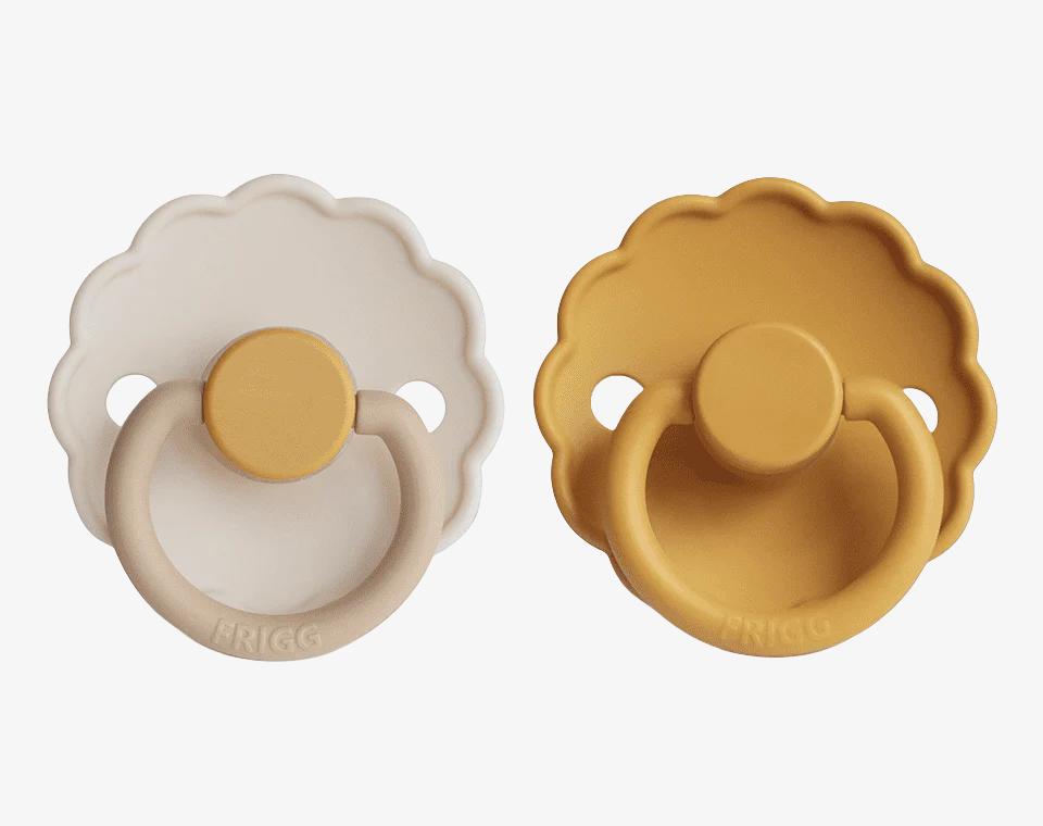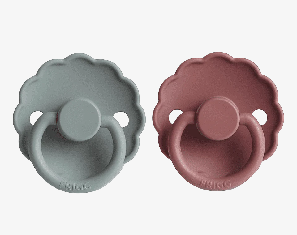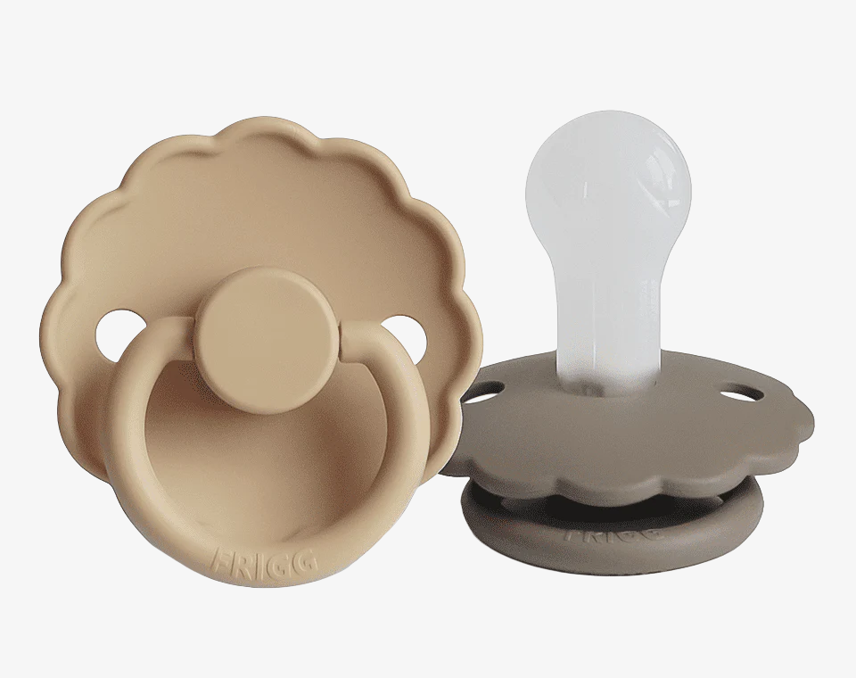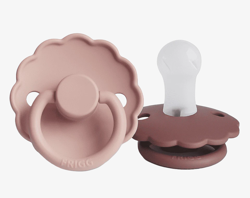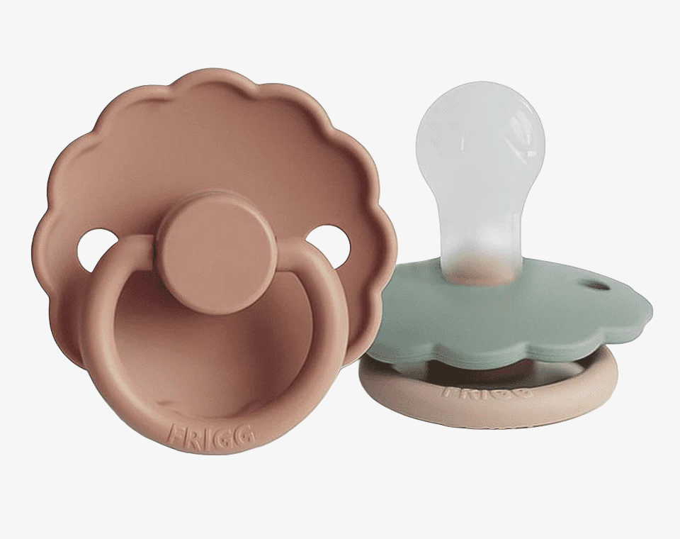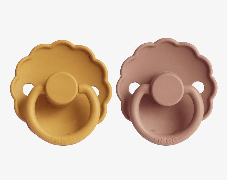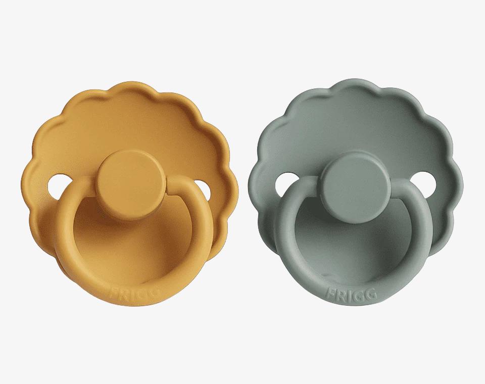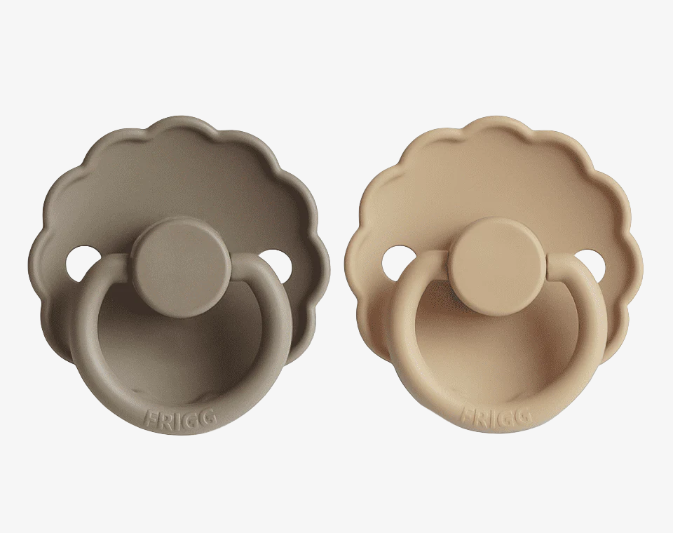 זוג מוצצי סיליקון מקולקציית DAISY מבית FRIGG עוצבו בקפידה בכדי לשמור על נוחות תינוקכם.