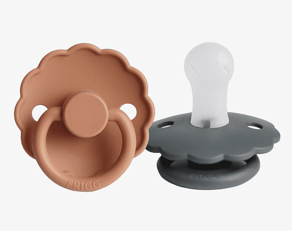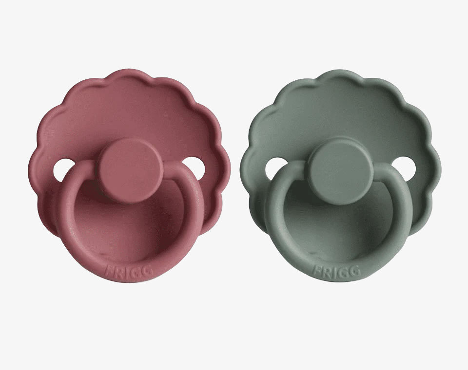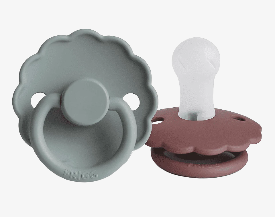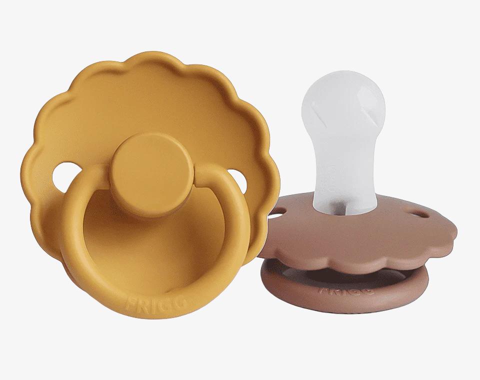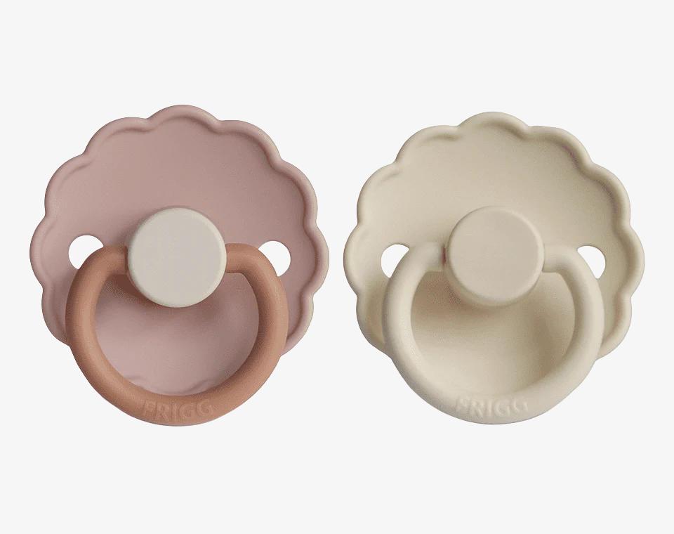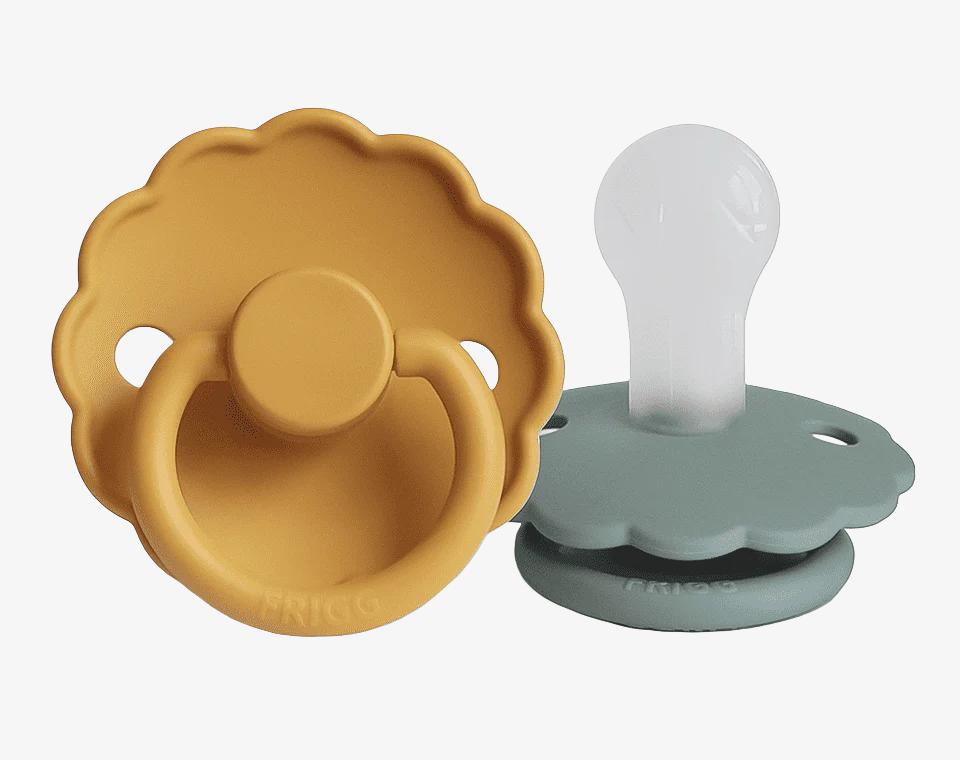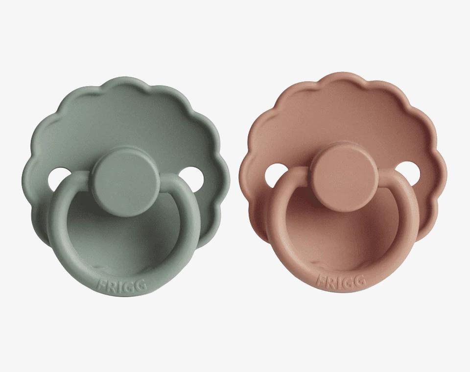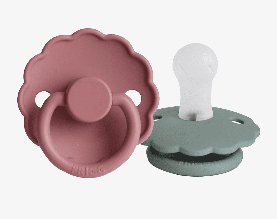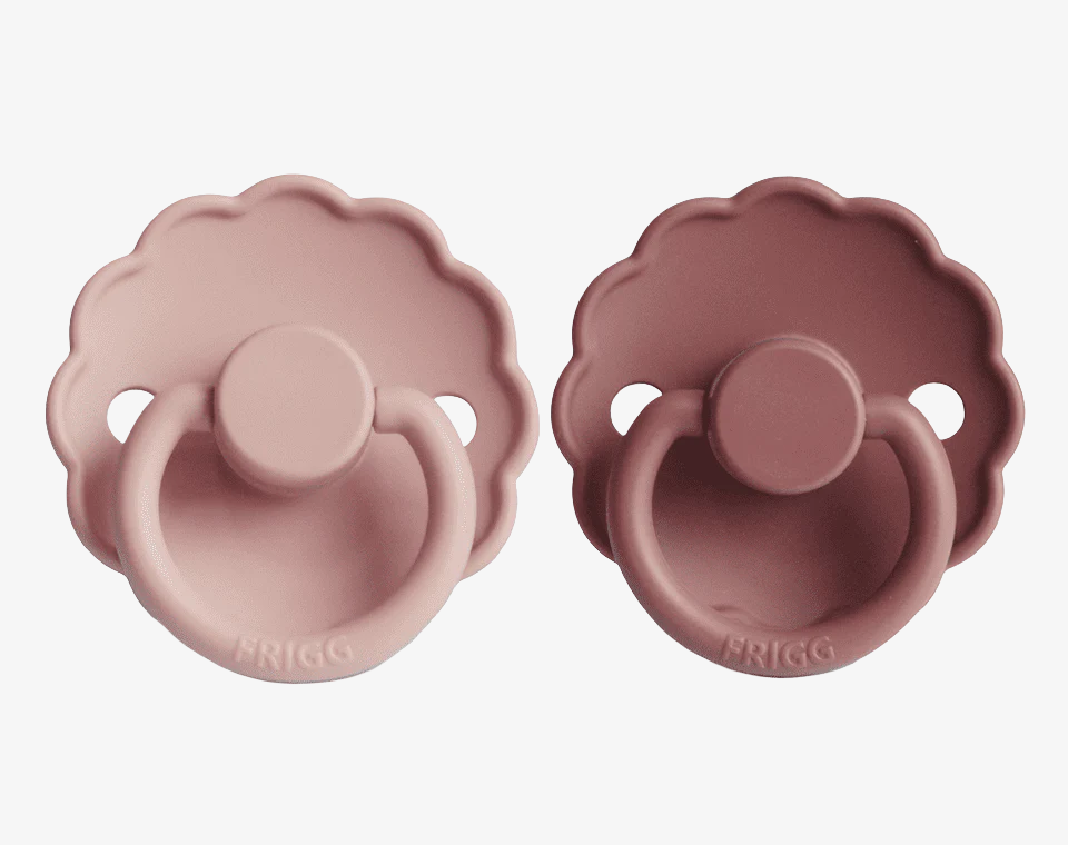 זוג מוצצי סיליקון מקולקציית DAISY מבית FRIGG עוצבו בקפידה בכדי לשמור על נוחות תינוקכם.