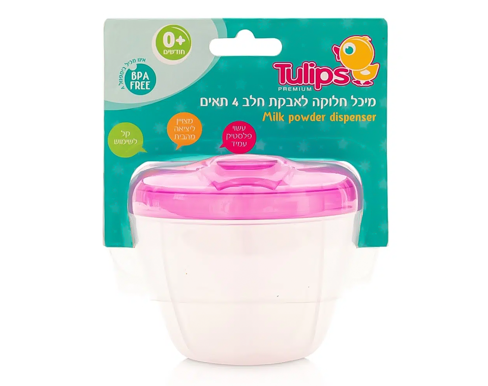 - מיכל חלוקת אבקת חלב בעל 4 תאים, המיכל נוח, קל לשימוש ומאפשר נשיאה של מזון תינוקות בצורה נוחה גם מחוץ לבית.