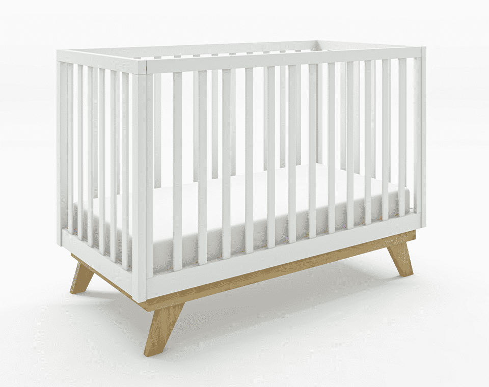 מיטת תינוק דגם מילאנו מבית רהיטי טל בעיצוב חדשני בצבע לבן עם שילוב עץ.