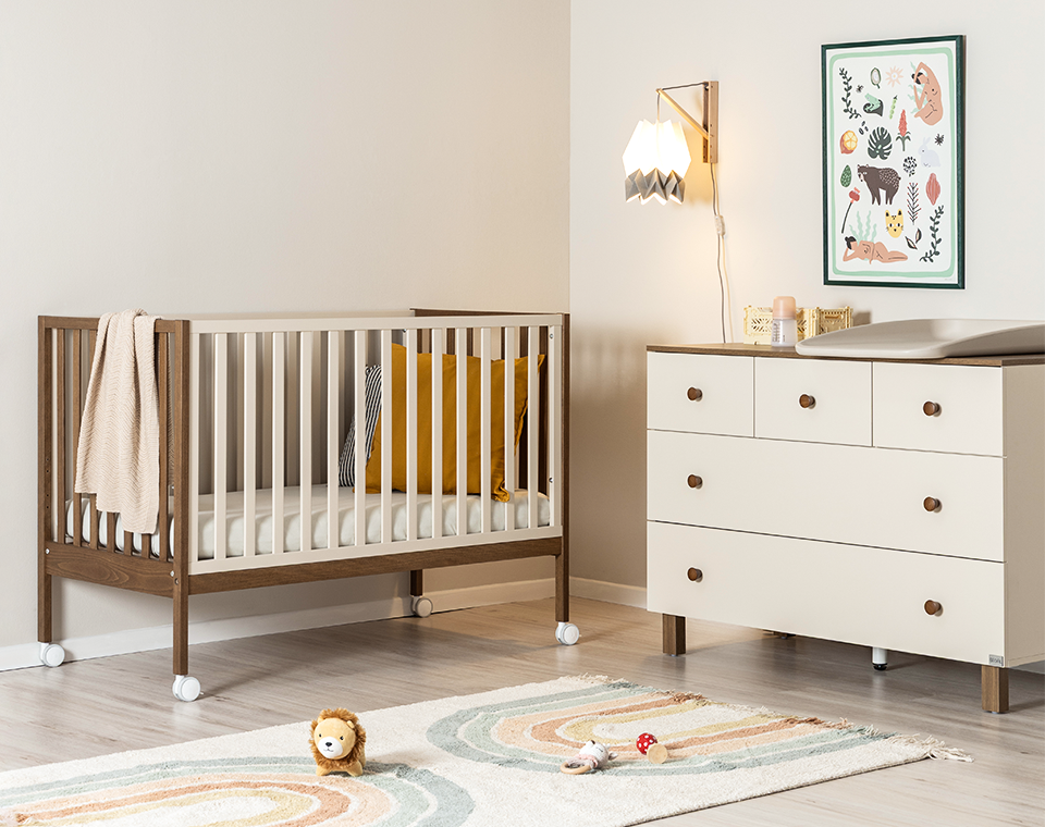 עיצוב חם ונקי בגווני חלב שקדים ועץ אגוז, במיטה שמתאימה לכל חדר וגדלה עם הילד.