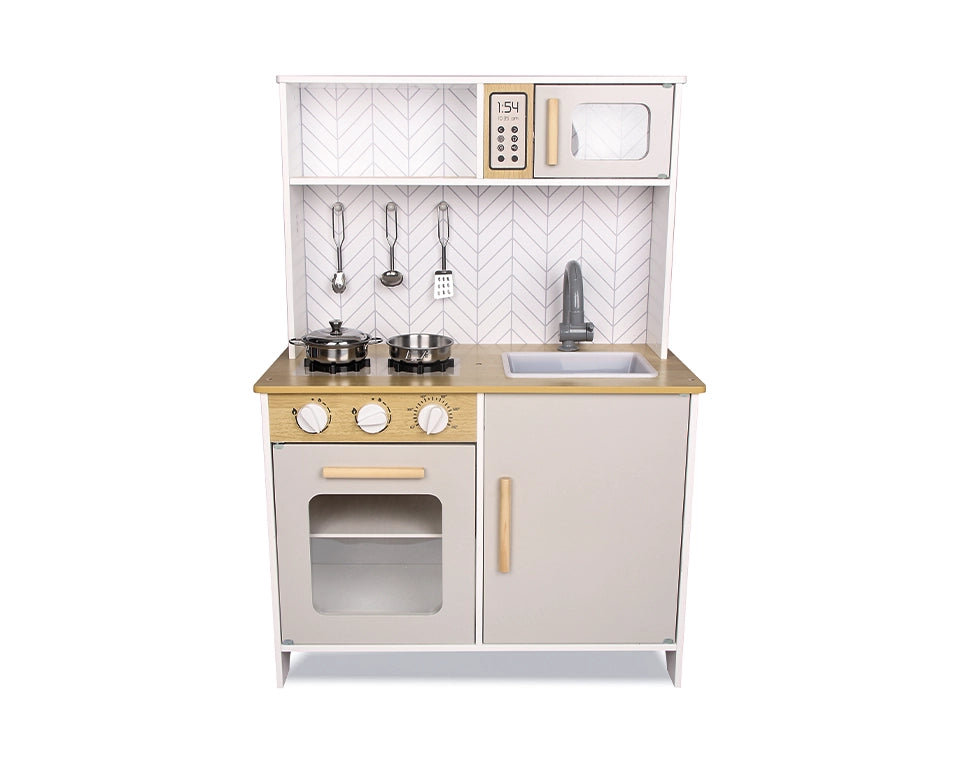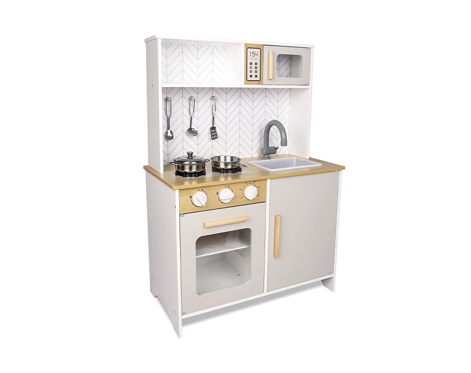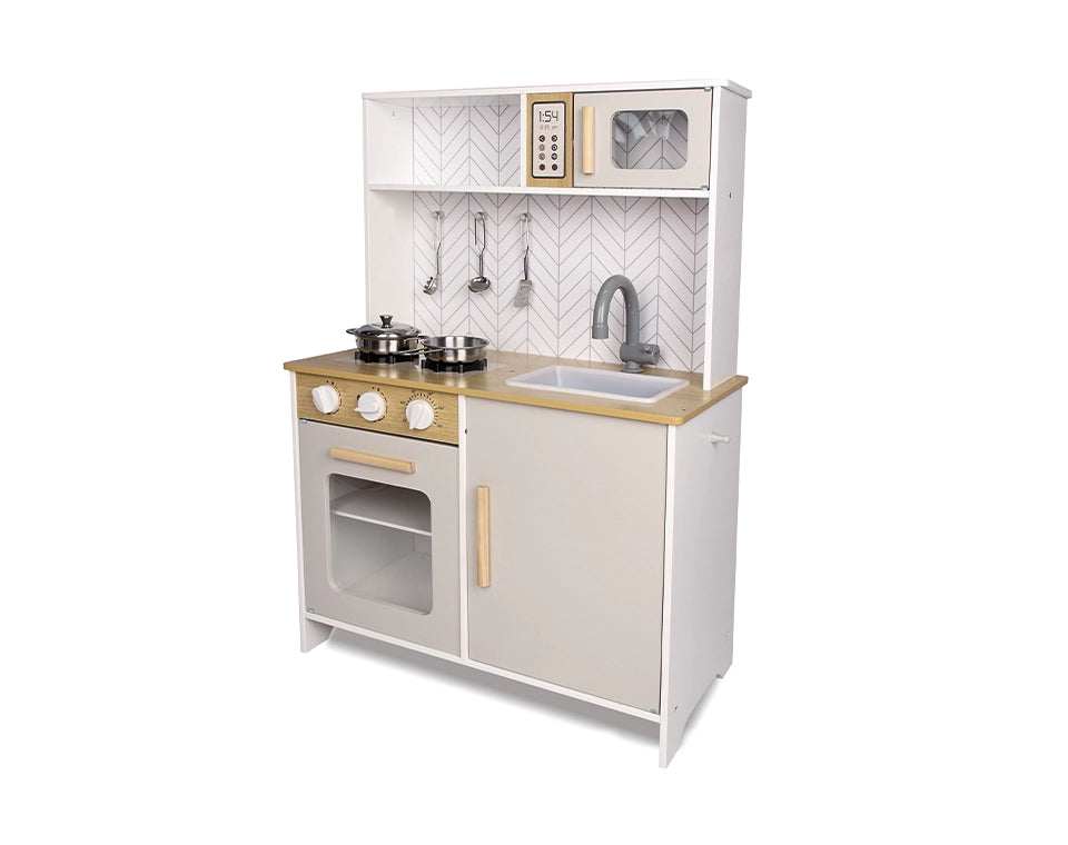 מטבח עץ לילדים המעודד דמיון, יצירתיות ומשחק תפקידים. כולל תנור, כיריים, כיור, מיקרוגל ואביזרי בישול, בעיצוב איכותי ויציב.