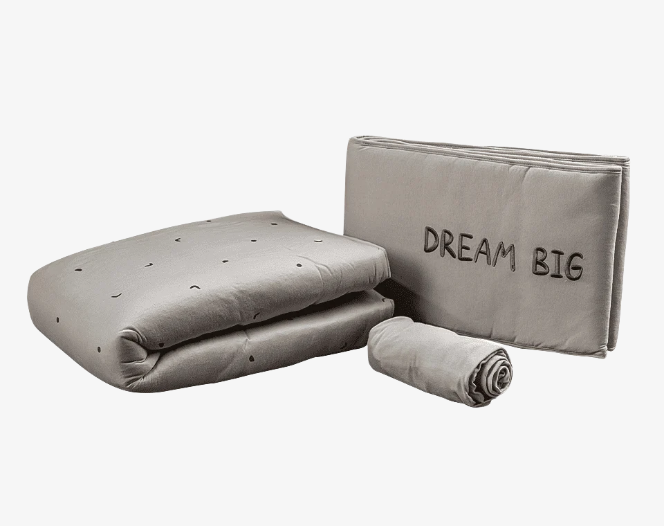 הסט מכיל- סדין למיטת תינוק/ מעבר, שמיכה רב עונתית ומגן ראש מתכבס